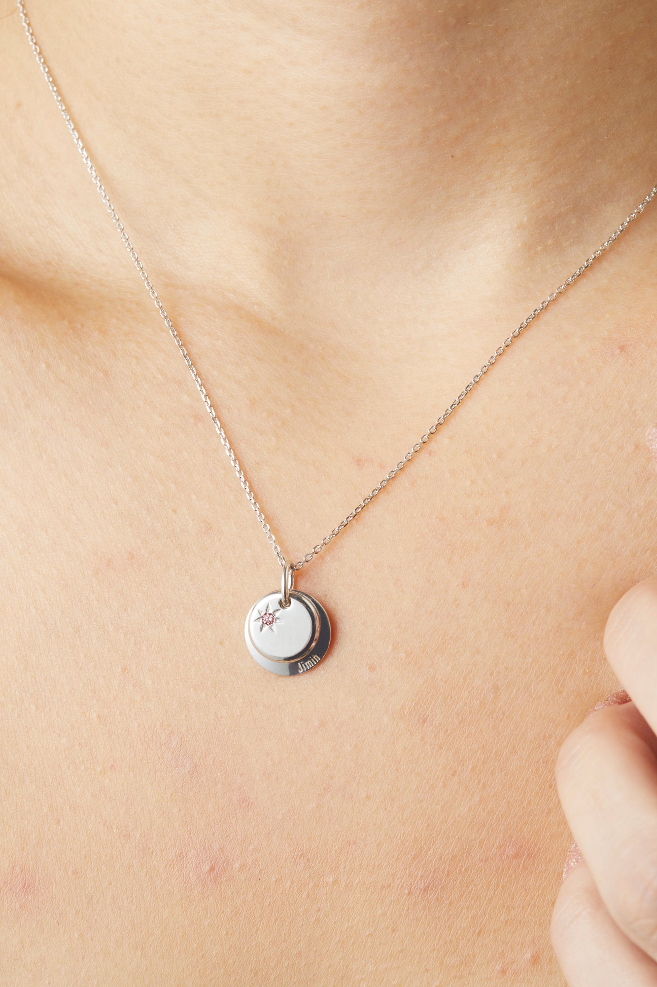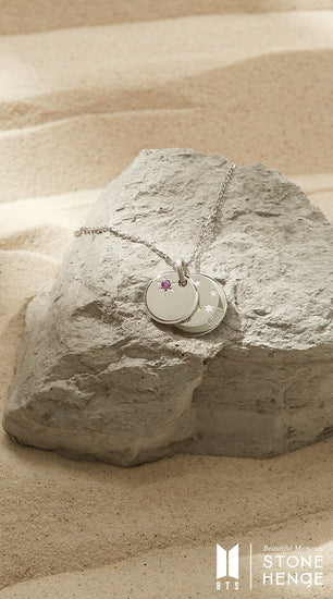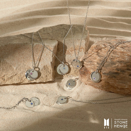 宇宙を象徴する2つのサークル型ペンダントに7つの誕生石とBTSロゴが刻まれています。それぞれの誕生石が、モダンな魅力を放ちます。